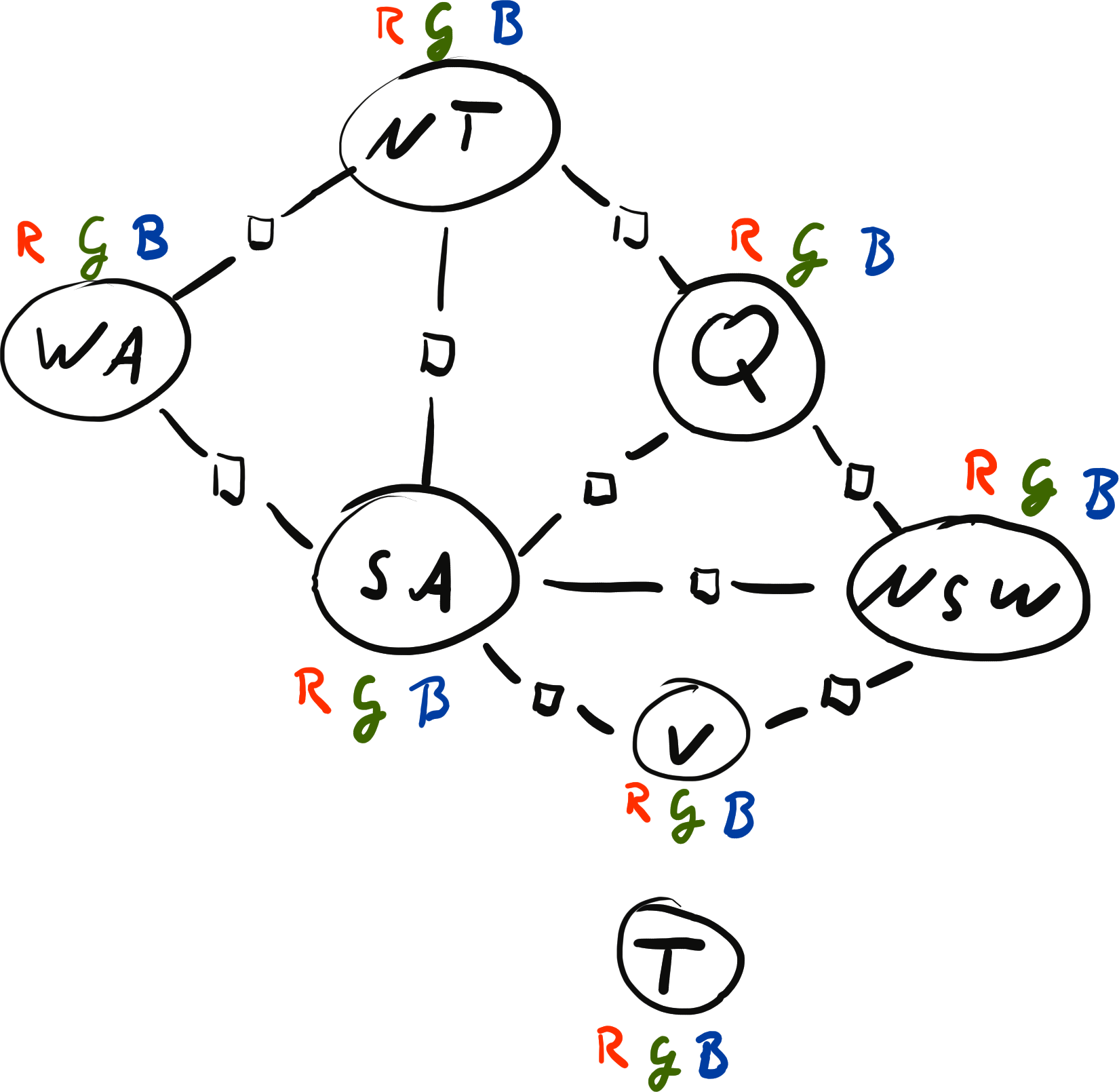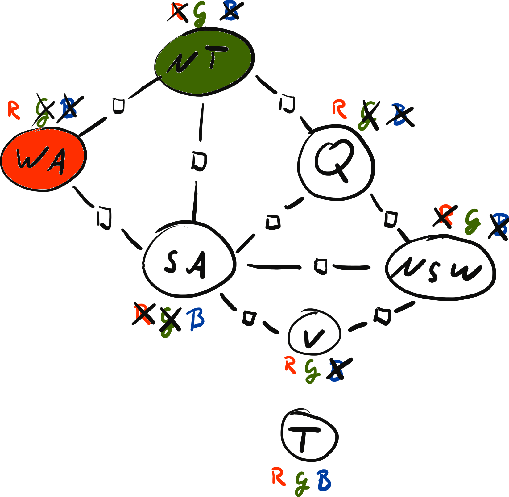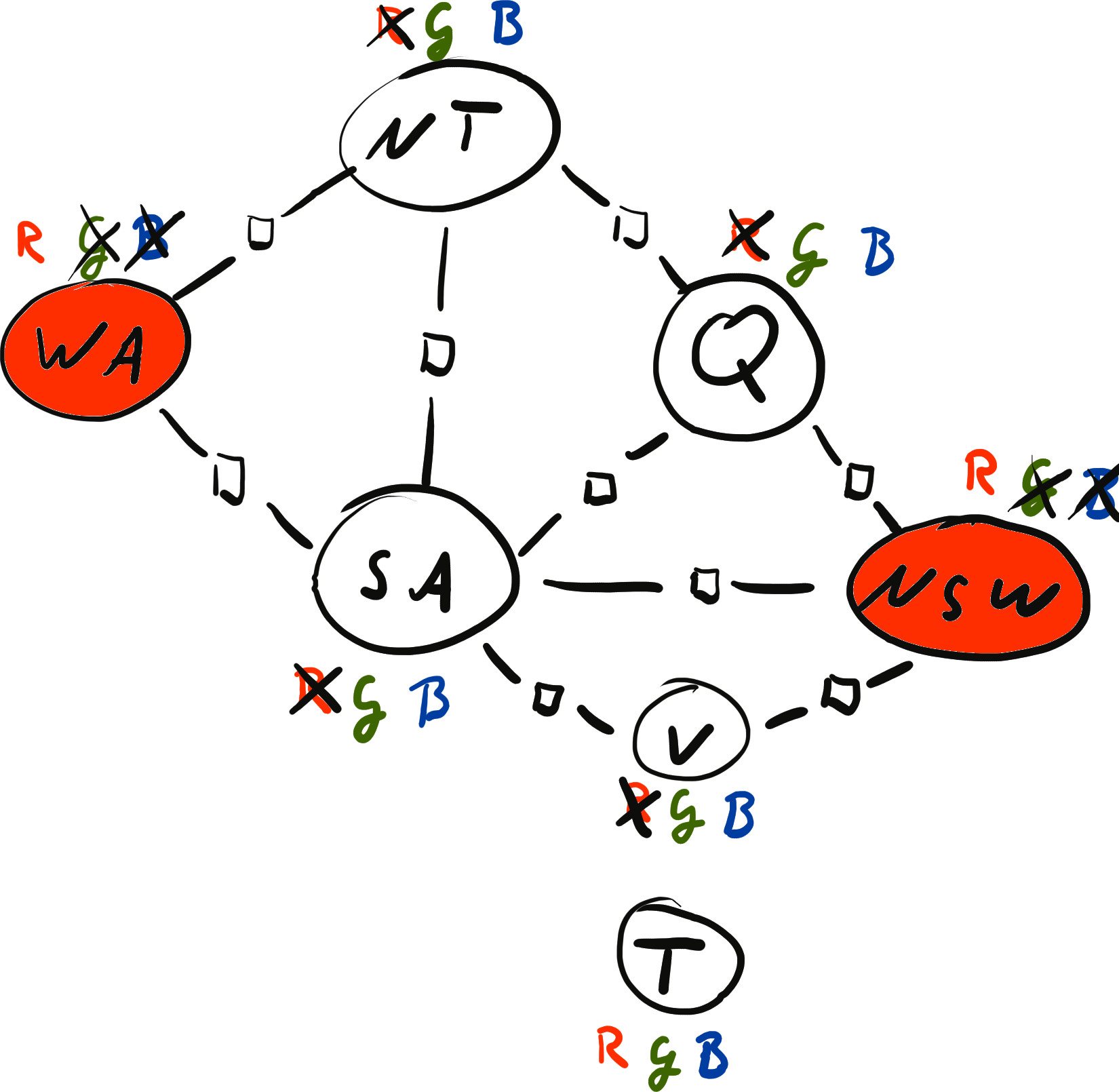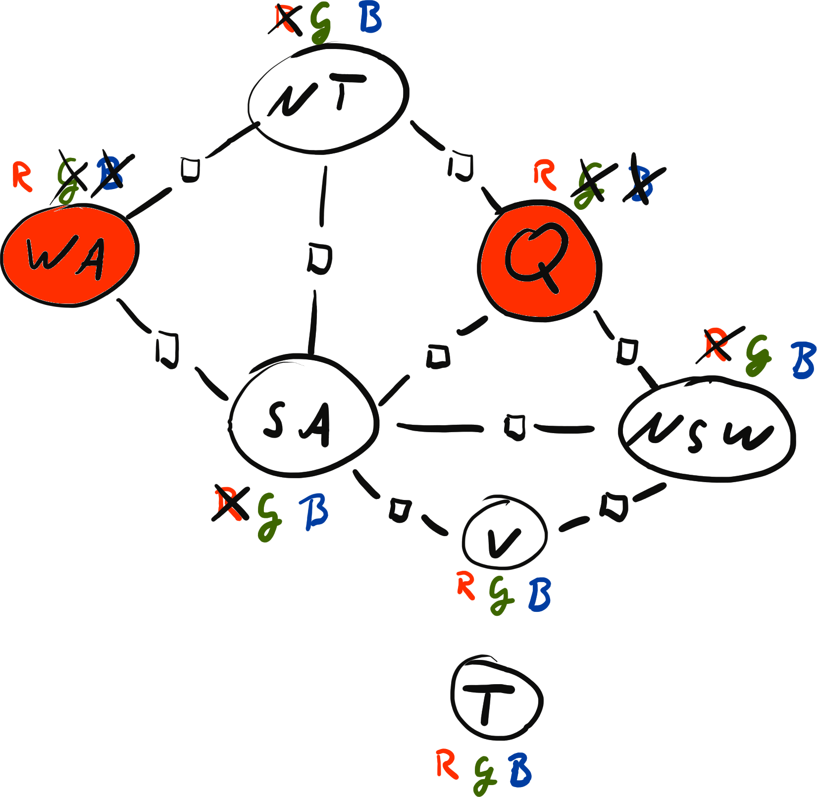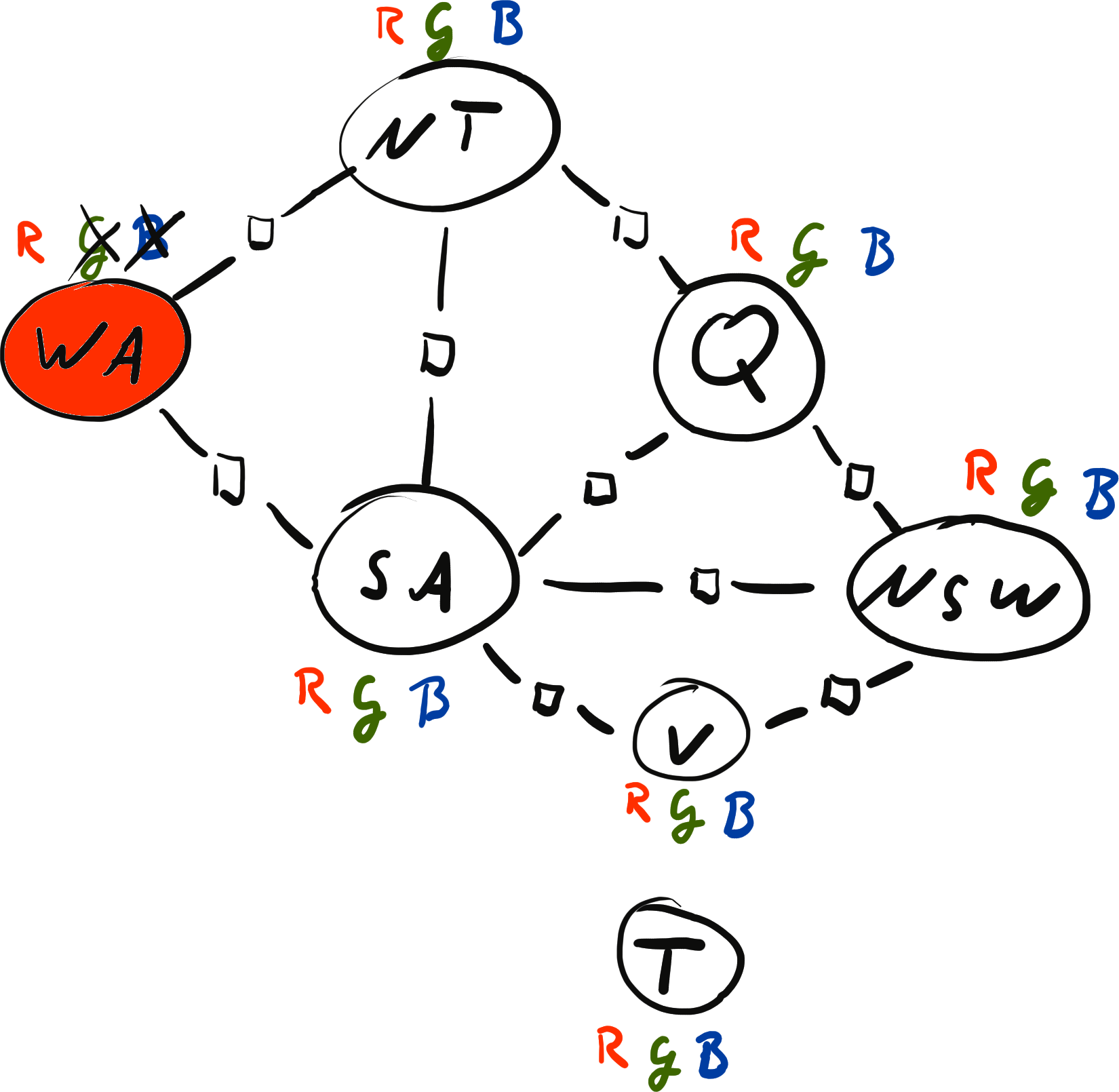 \[ x = \{ \text{WA}: {\color{red} R}, \text{NT}: {\color{red} R}, \text{SA}: {\color{blue} B}, \text{Q}: {\color{red} R}, \text{NSW}: {\color{green} G}, \text{V}: {\color{red} R}, \text{T}: {\color{blue} B}\} \\[2mm] \operatorname{weight}(x) = 0 \cdot 0 \cdot 1 \cdot 1 \cdot 1 \cdot 1 \cdot 1 \cdot 1 \cdot 1 = 0 \]