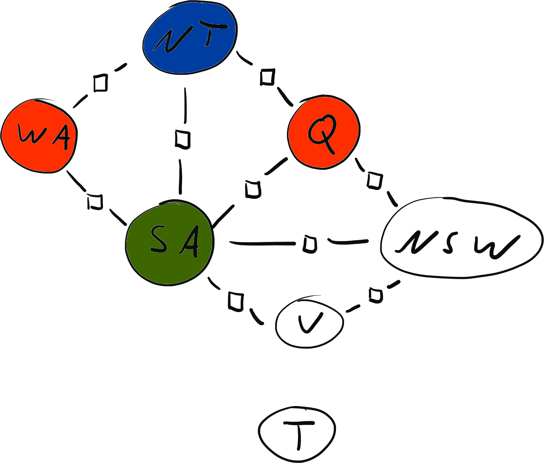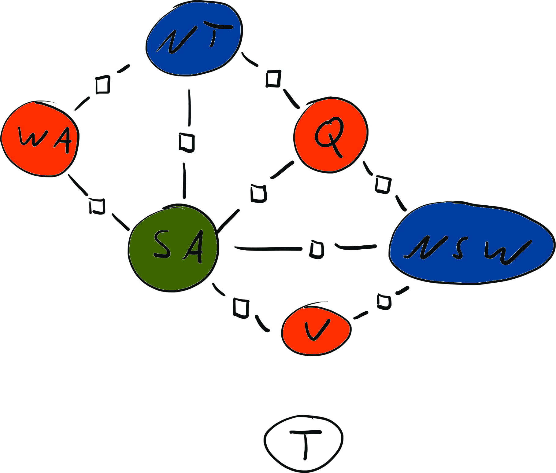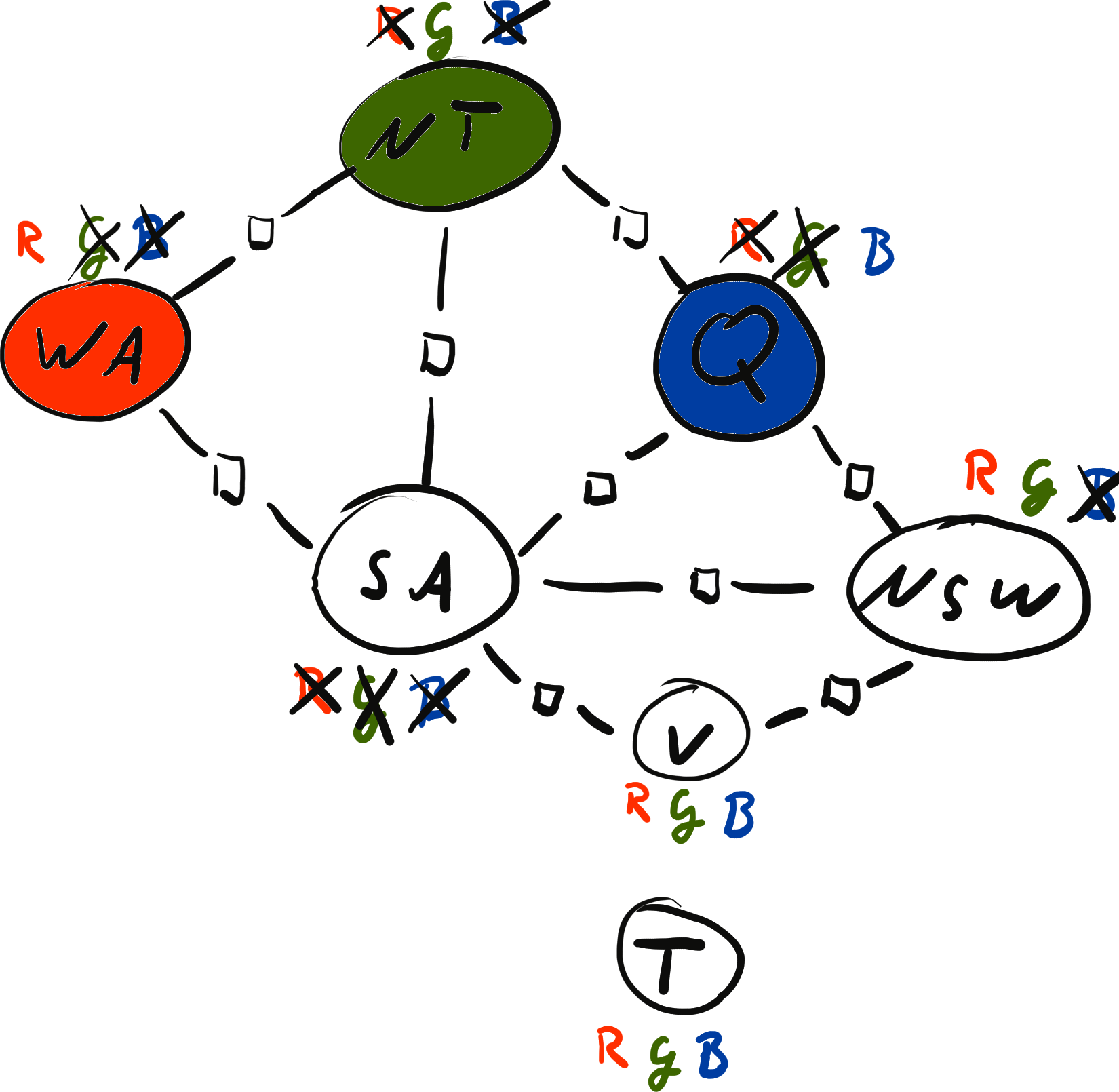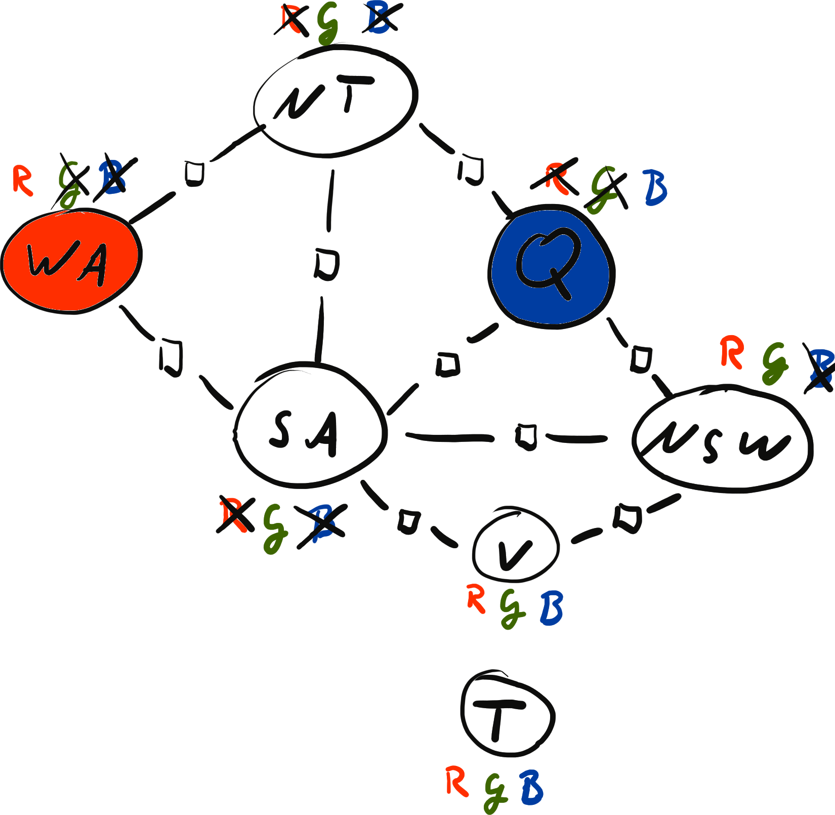\[ x = \{ \text{WA}: {\color{red} R}, \text{NT}: {\color{red} R}, \text{SA}: {\color{blue} B}, \text{Q}: {\color{red} R}, \text{NSW}: {\color{green} G}, \text{V}: {\color{red} R}, \text{T}: {\color{blue} B}\} \\[2mm] \operatorname{weight}(x) = 0 \cdot 0 \cdot 1 \cdot 1 \cdot 1 \cdot 1 \cdot 1 \cdot 1 \cdot 1 = 0 \]