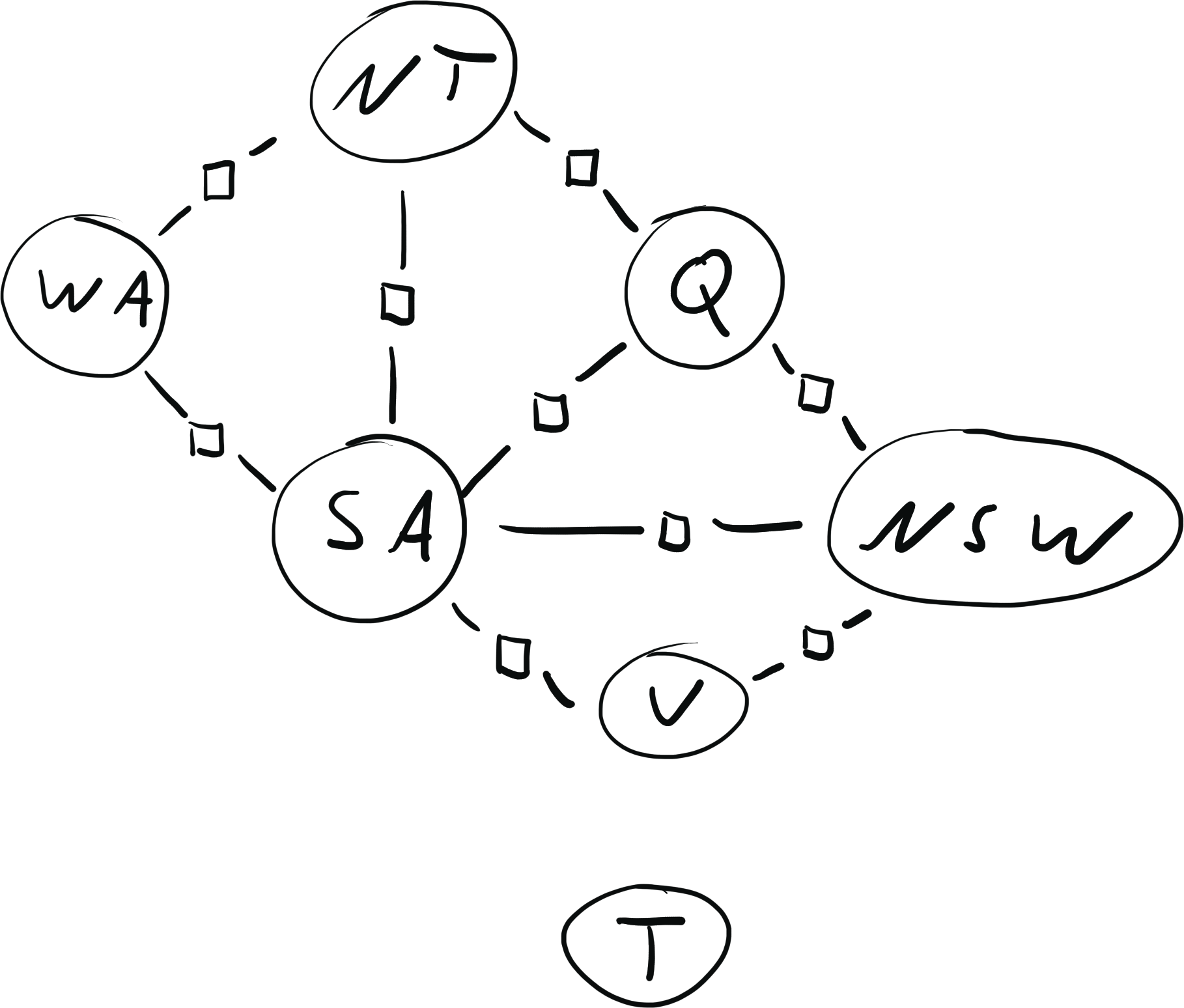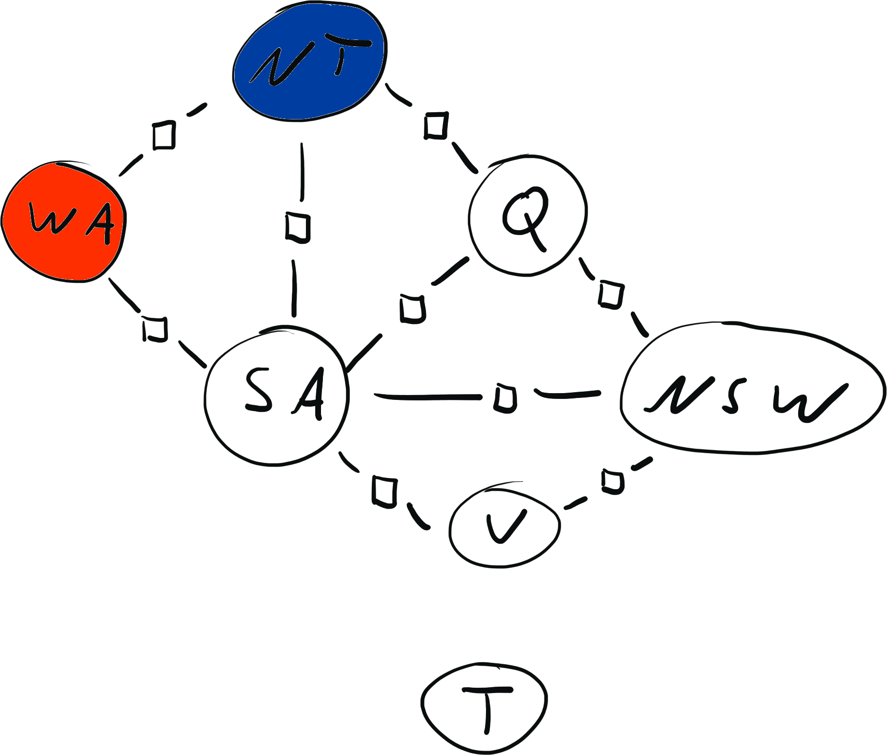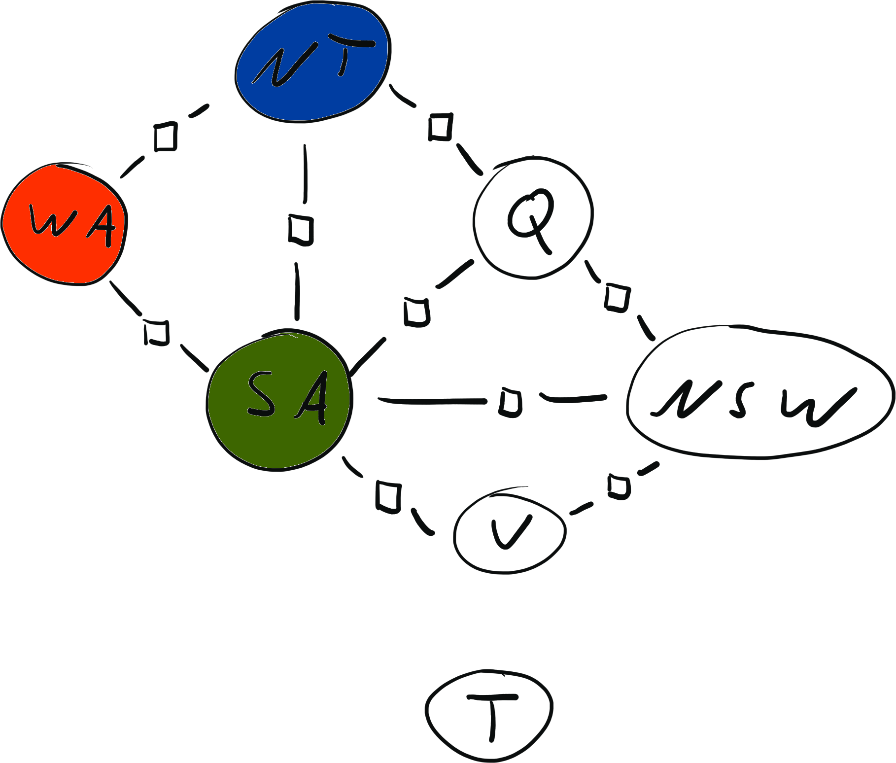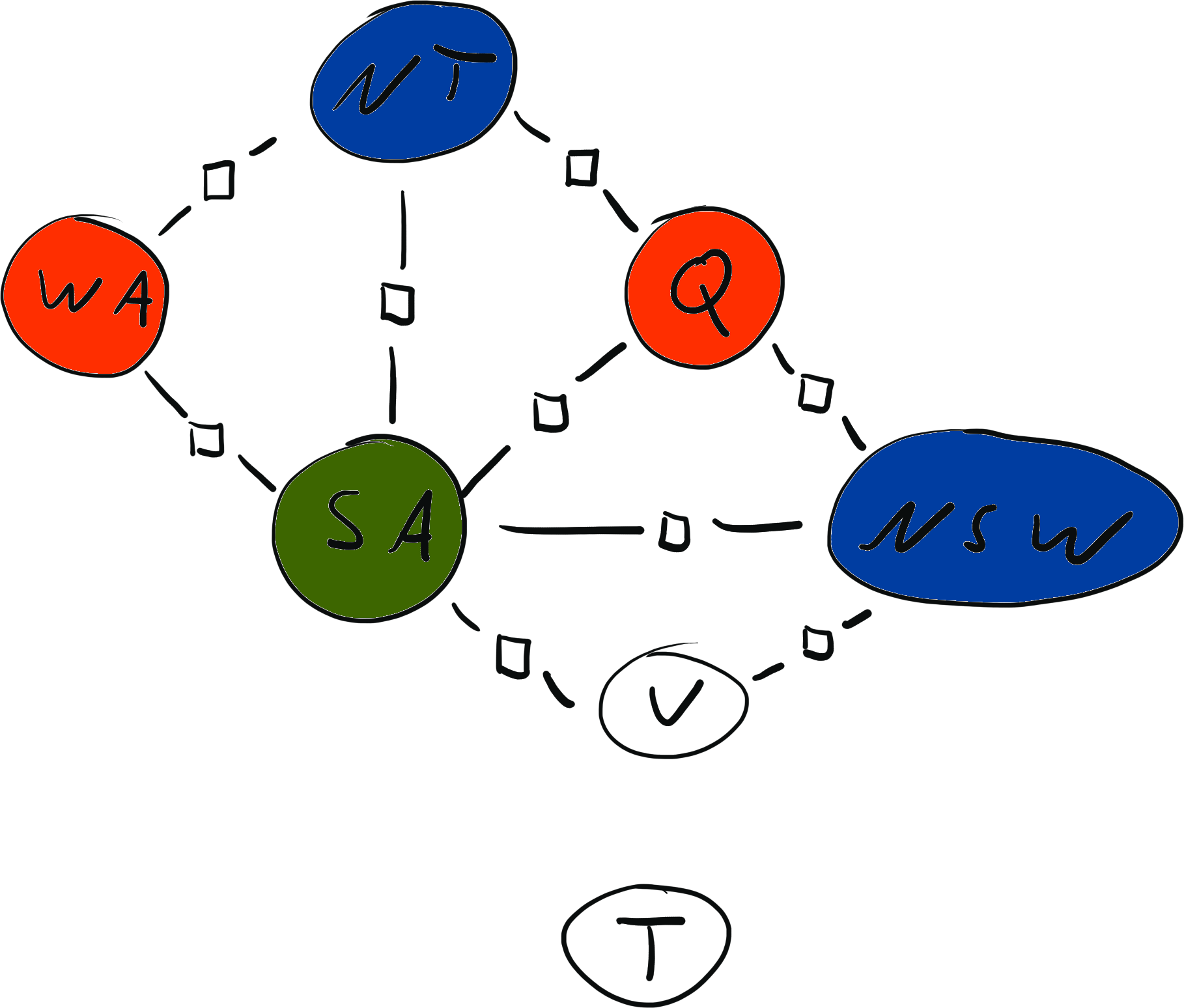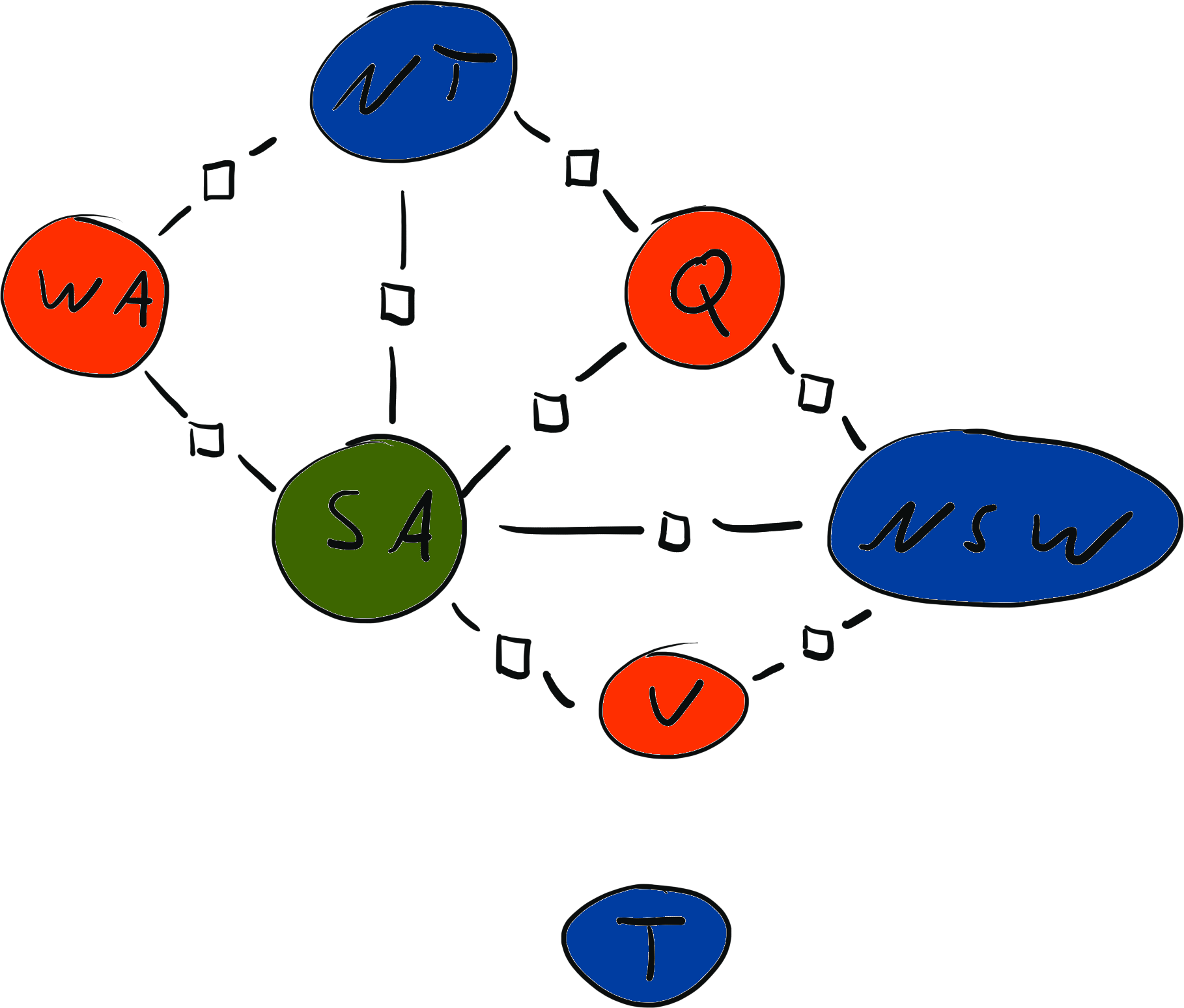\[ x = \{ \text{WA}: {\color{red} R}, \text{NT}: {\color{red} R}, \text{SA}: {\color{blue} B}, \text{Q}: {\color{red} R}, \text{NSW}: {\color{green} G}, \text{V}: {\color{red} R}, \text{T}: {\color{blue} B}\} \\[2mm] \operatorname{weight}(x) = 0 \cdot 0 \cdot 1 \cdot 1 \cdot 1 \cdot 1 \cdot 1 \cdot 1 \cdot 1 = 0 \]