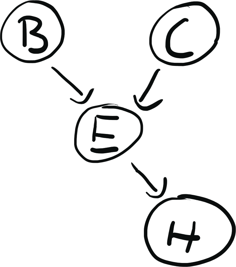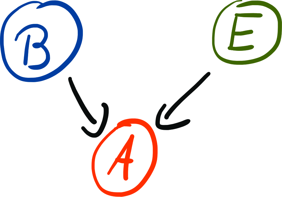 $P(B=b, E=e, A=a) = {\color{blue} p(b)}{\color{green} p(e)}{\color{red} p(a | b,e)}$