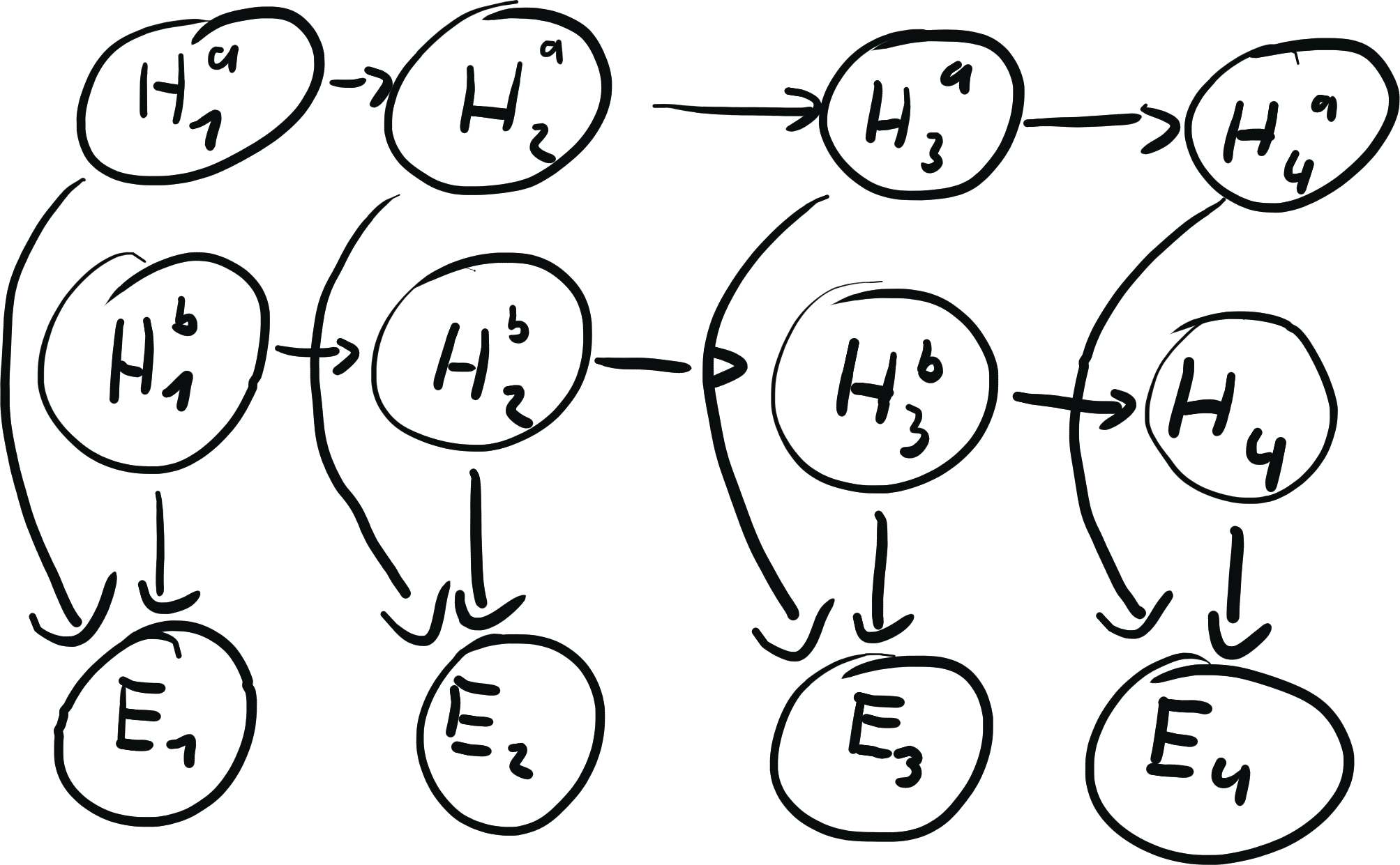 P(H=h, E=e) = p_\text{start}(h_1) \prod_{i =2}^n p_\text{trans} (h_i | h_{i-1}) \prod_{i=1}^n p_\text{emit}(e_i | h_i)